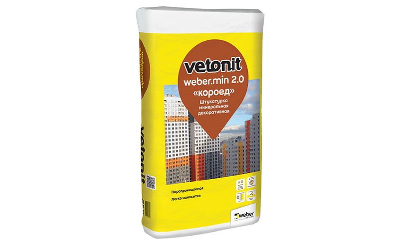 Декоративная штукатурка weber.min для тонкослойной финишной отделки в системах фасадного утепления. Подходит для декоративной отделки стен внутри и снаружи помещений, с последующей окраской вододисперсионными красками.